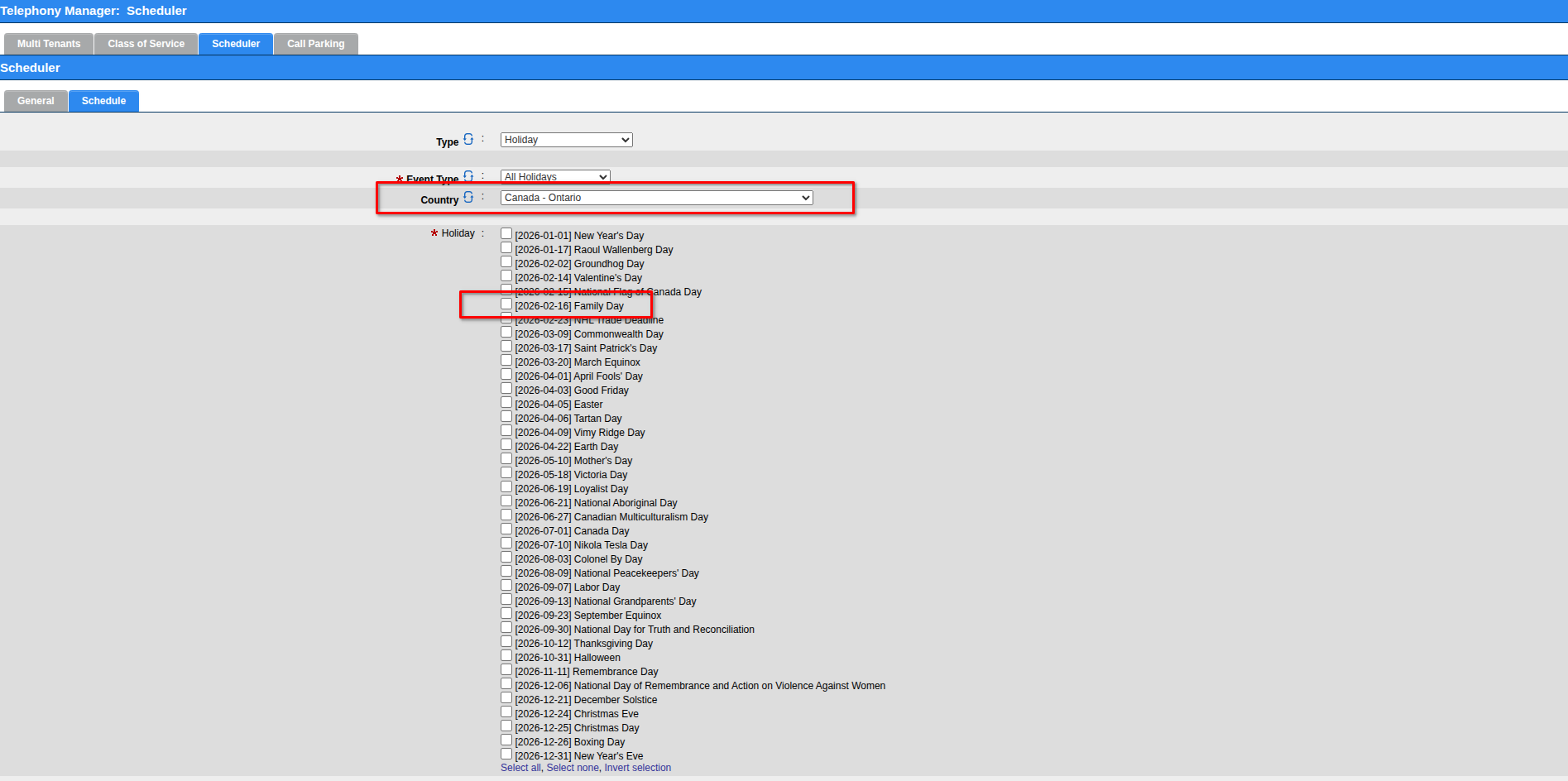 Shows Provincial specific Holidays such as Family Day.