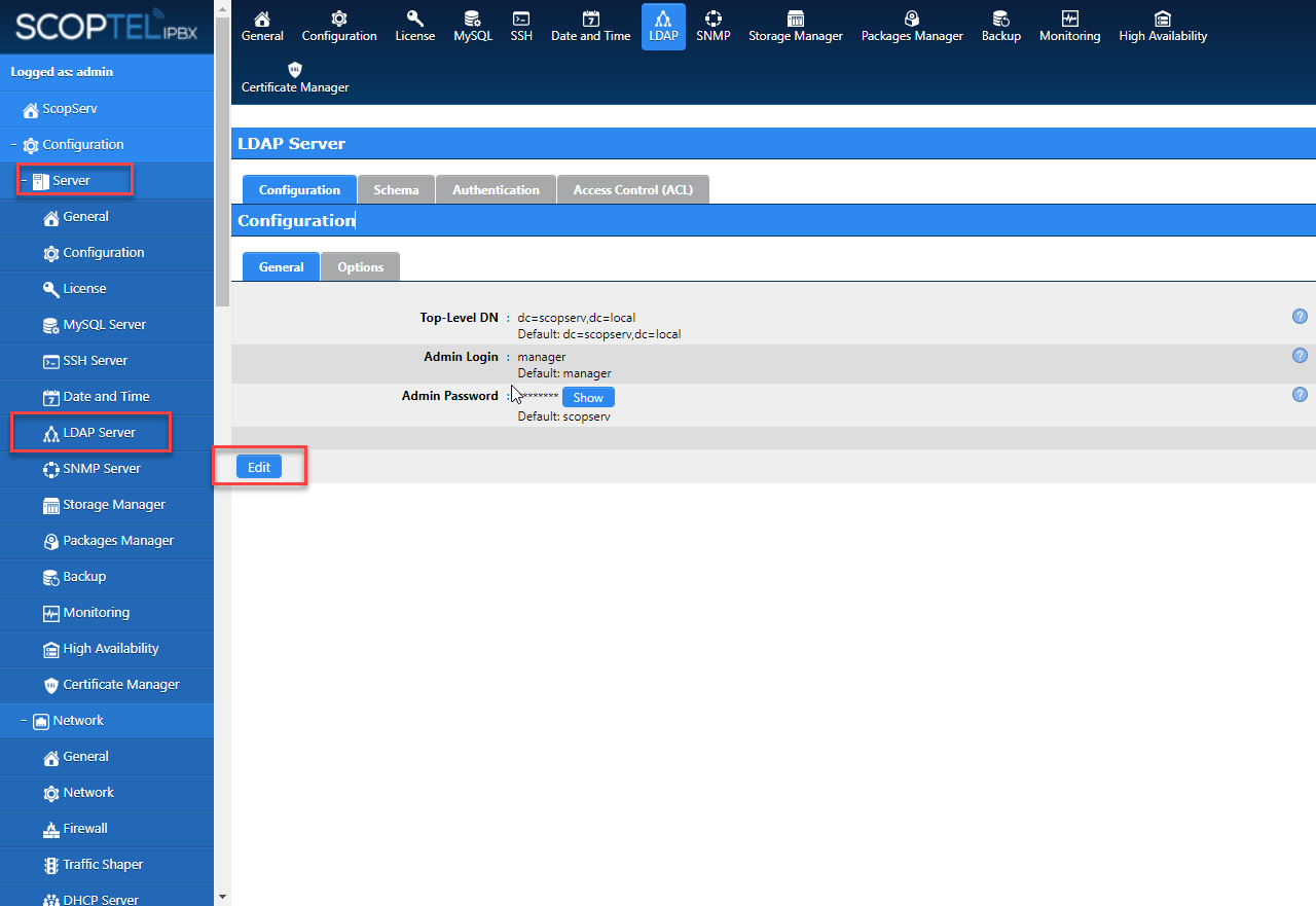 Log into ScopTEL GUI and go on Server -> LDAP Server